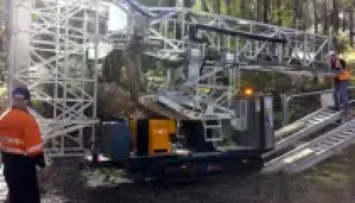 Tracked machine with a 5.0 m long and 1.1 m high platform for inspection and maintenance of road bridges.