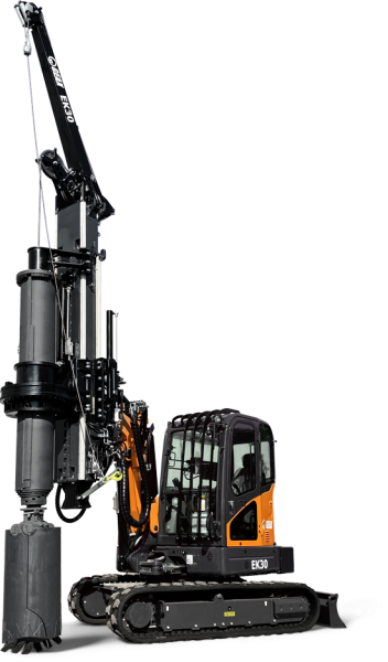 The EK30 Hydraulic Piling Rig features Geax’s unique architecture with a long supporting boom and a sliding mast, enabling maximum tool positioning flexibility. Designed for long reach drilling, low headroom applications, and maximized casing height, it offers proverbial stability and compact dimensions for operations on slopes, uneven terrain, and tight spaces. This highly versatile rig can be easily adapted using modular kits for Kelly drilling, CFA, diaphragm walls, soil mixing, and soil displacement.