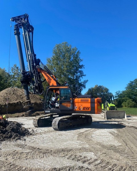 The EK90 Hydraulic Piling Rig features Geax’s unique architecture with a long supporting boom and a sliding mast, enabling maximum tool positioning flexibility. Designed for long reach drilling, low headroom applications, and maximized casing height, it offers proverbial stability and compact dimensions for operations on slopes, uneven terrain, and tight spaces. This highly versatile rig can be easily adapted using modular kits for Kelly drilling, CFA, diaphragm walls, soil mixing, and soil displacement.