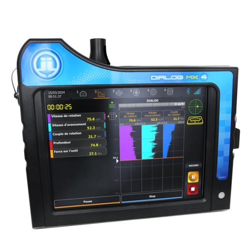 The DIALOG MX4 is a highly ergonomic, rugged data logger specifically engineered for the precise measurement and control of special foundation engineering processes. Featuring a robust touch screen interface, it enables seamless data synchronization across corporate networks for both permanently and intermittently connected users. This device allows simultaneous recording of measurements in time and depth, coupled with real-time data transmission via Wifi, Ethernet, or mobile networks. Integrated with internal GPS for accurate localization, it supports remote configuration, update deployments, and machine parameter monitoring, ensuring optimal site management.
